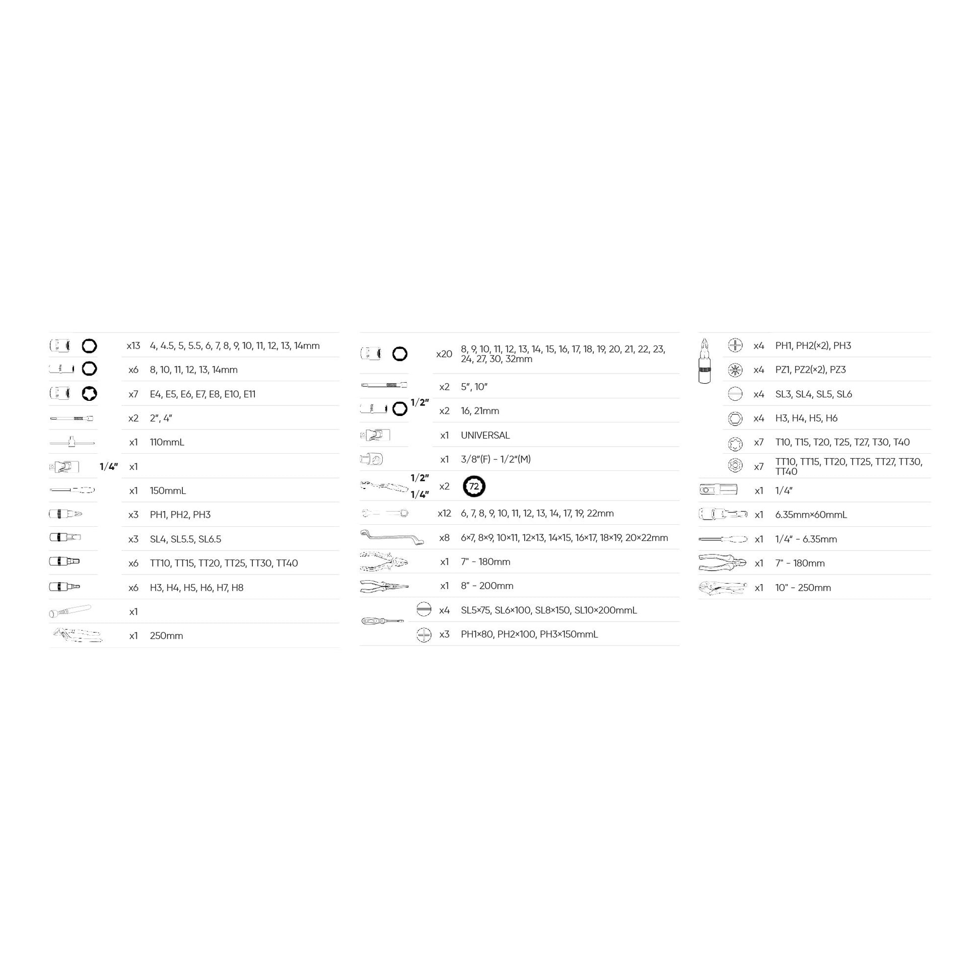 · Vaso Hex 1/4": 4 mm, 4.5 mm, 5 mm, 5.5 mm, 6 mm, 7 mm, 8 mm, 9 mm, 10 mm, 11 mm, 12 mm, 13 mm, 14 mm