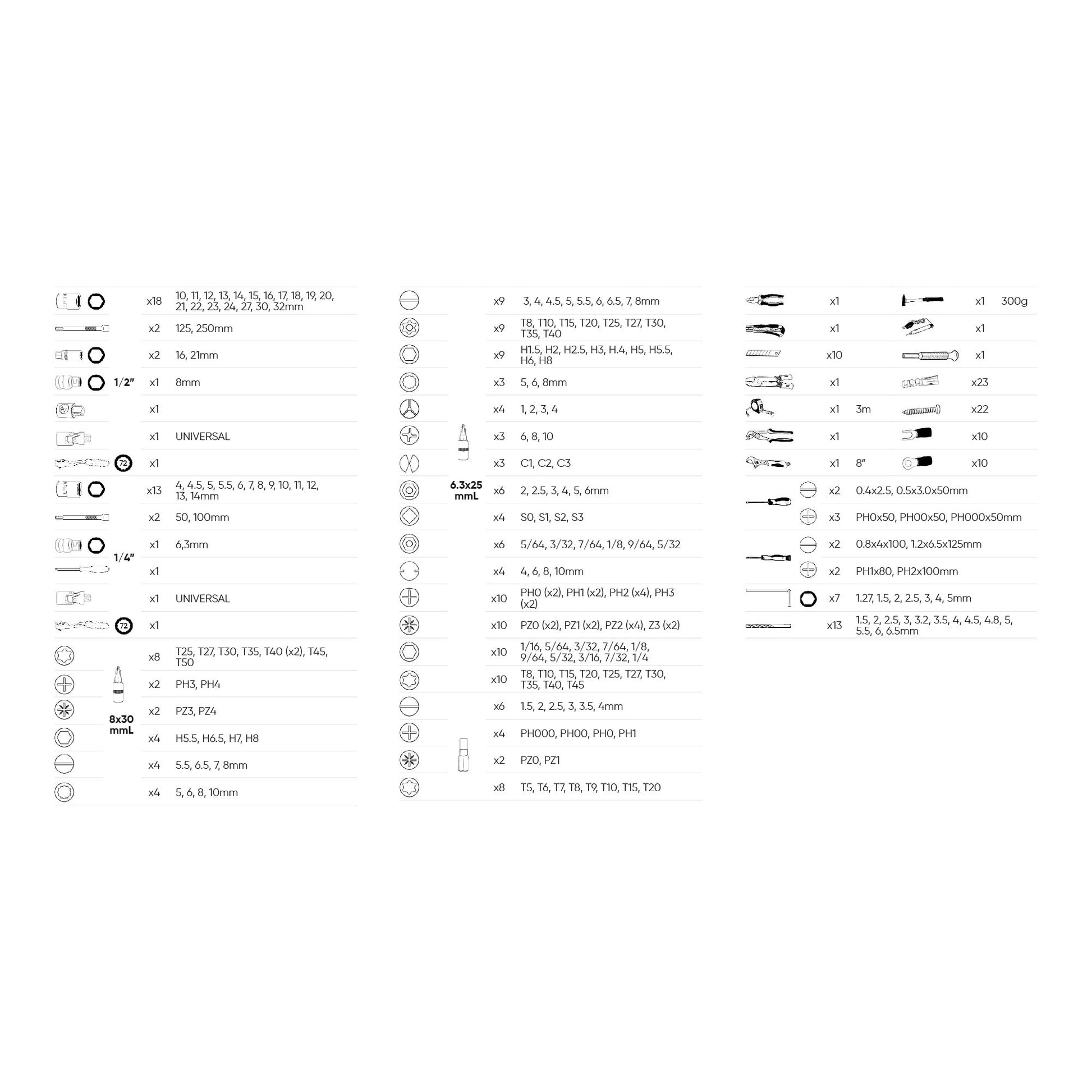 8 Torx (TX): T25, T27, T30, T35, T40 (x2), T45, T50;
