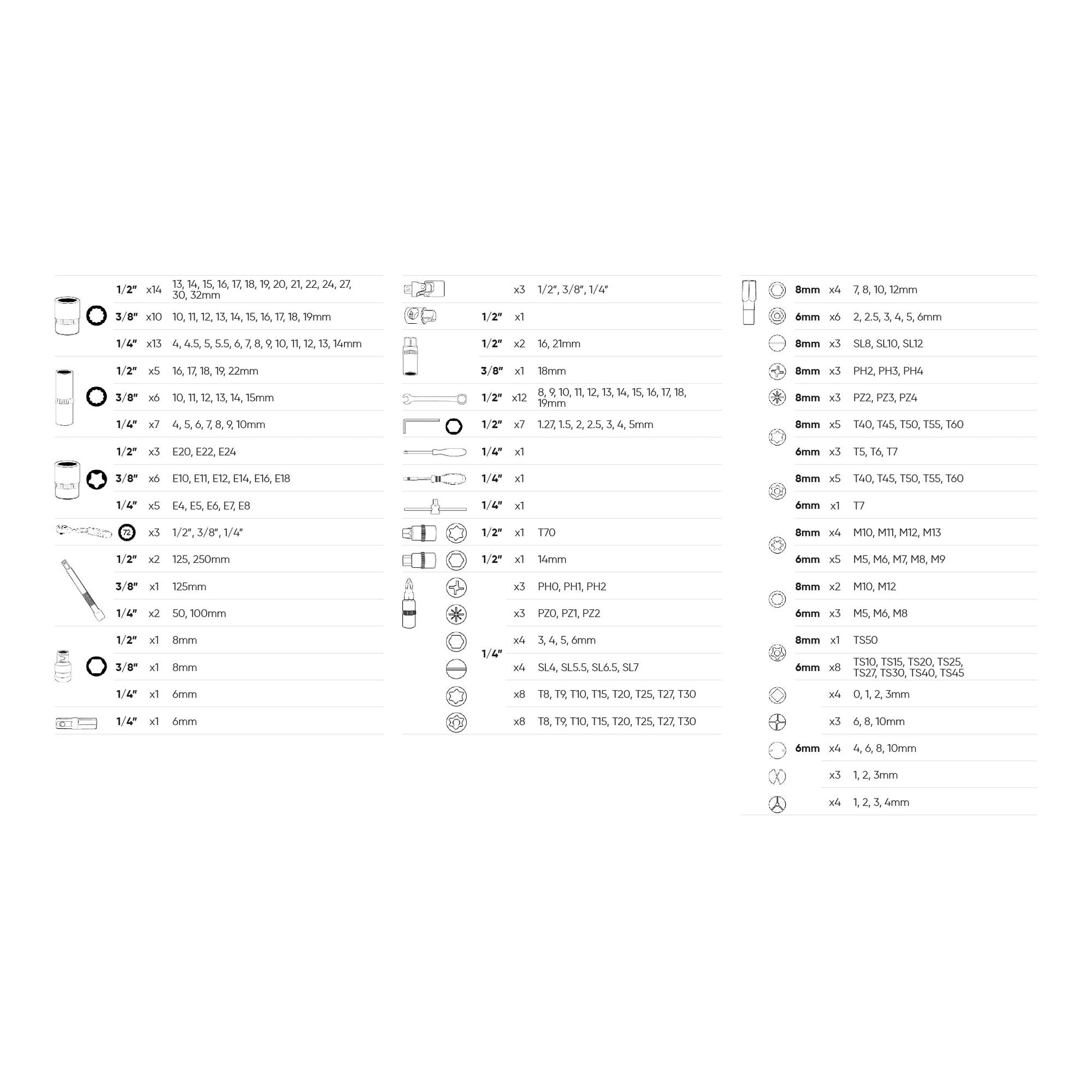 Este conjunto é um kit profissional e completo que utiliza o perfil de 12 faces (XZN / Bi-Hexagonal), em vez do perfil hexagonal (6 faces) mais comum. O perfil XZN é ideal para maior transferência de torque e para ser usado em porcas e parafusos onde o acesso é difícil.