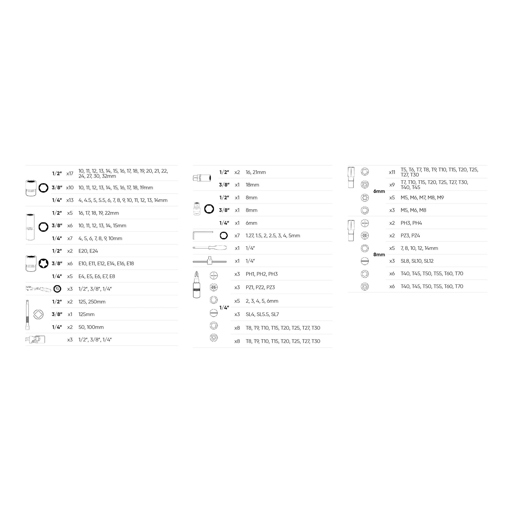 A principal característica deste conjunto é que ele incorpora três medidas de encaixe (quadrado) em uma única mala: 1/4", 3/8" e 1/2", o que aumenta a sua versatilidade para diferentes tipos de fixadores e torques.